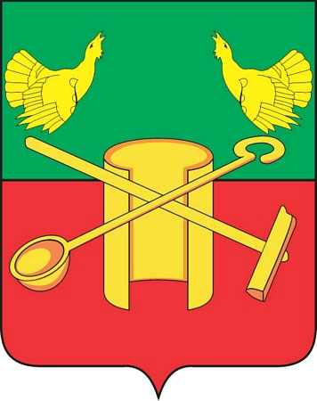 Герб города Кольчугино был принят 25 июля 2002 года. «В пересеченном зеленью и червленью (красным) щите поверх свитка скрещенные молот и ковш; во главе два токующих глухаря. Все фигуры золотые».