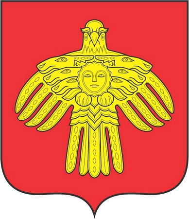 Герб Республики Коми был принят 6 июня 1994 года. Он представляет собой исполненное по мотивам пермского звериного стиля изображение золотой хищной птицы, помещенной на красном геральдическом щите; на груди птицы — лик женщины в обрамлении шести лосиных голов.