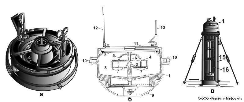Судовой магнитный компас (а — внешний вид; б — поперечный разрез; в — крепление компаса): 1 — корпус (котелок) компаса, герметически закрытый стеклом 2; 3 — остриё (шпилька) для установки картушки 4 (диска с полушаровым поплавком 5 в середине); 6 — агатовая опора («топка»); 7 — магнитная система компаса (из 4 — 6 магнитных стрелок); 8 — объём, заполняемый жидкостью; 9 — груз для увеличения остойчивости котелка; 10 — цапфы для крепления компаса в кардановом подвесе; 11 — линейка-пеленгатор с укрепленными на ней предметной 12 и глазной 13 мишенью для наведения на ориентир; 15 — шкафчик (нактоуз) для крепления компаса на палубе; 16 — девиационный прибор.
