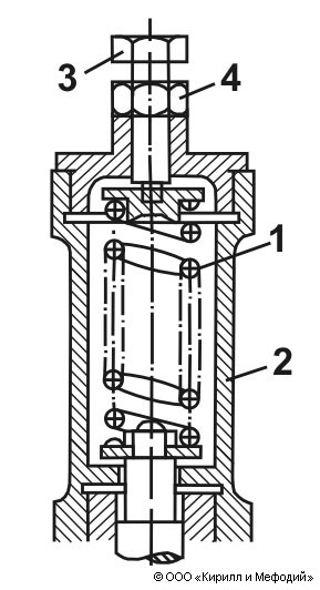 Компенсация отклонений, изменяющих усилие пружины, регулировочным винтом: 1 — пружина; 2 — корпус; 3 — регулировочный винт; 4 — контргайка.