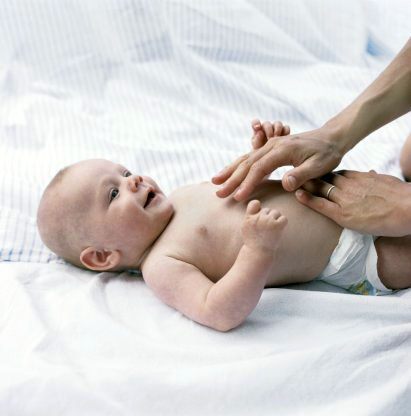Исходное положение: на спине ногами к взрослому. Ладонью одной руки или ладонями обеих рук производят поглаживания прямых мышц живота вверх и вниз.