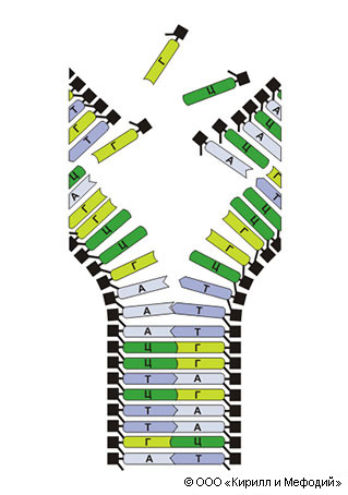 Участок молекулы ДНК: внизу две комплементарные нити образуют двойную цепь, вверху цепь разошлась и на каждой нити достраивается новая комплементарная ей. А — аденин, Г — гуанин, Т — тимин, Ц — цитозин.
