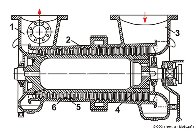 Осевой компрессор: 1 — канал для подачи сжатого газа; 2 — корпус; 3 — канал для всасывания газа; 4 — ротор; 5 — направляющие лопатки; 6 — рабочие лопатки.