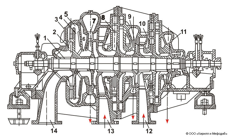 Центробежный компрессор: 1 — вал; 2, 6, 8, 9, 10 и 11 — рабочие колеса; 3 и 7 — кольцевые диффузоры; 4 — обратный направляющий канал; 5 — направляющий аппарат; 12 и 13 — каналы для подвода газа из холодильников;14 — канал для всасывания газа.