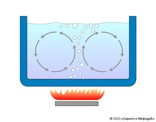 Конвекционные потоки, возникающие при нагревании воды в сосуде.