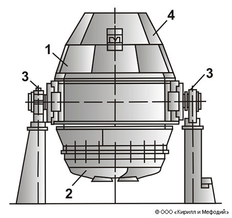 Кислородный конвертер: 1 — корпус; 2 — днище; 3 — опорные подшипники; 4 — шлем.