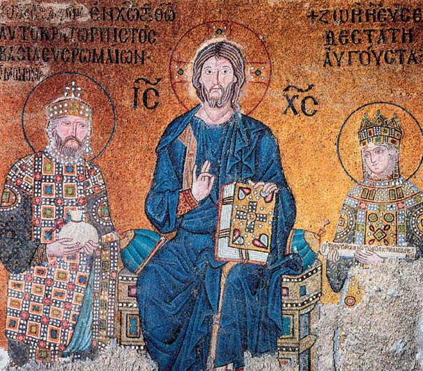 Император Константин IX Мономах и императрица Зоя перед Христом. Мозаика храма Святой Софии Константинопольской. 1034-1042 гг.