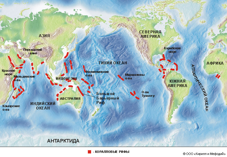 Коралловые рифы в общей сложности занимают на Земле площадь в 600 000 кв. км. Растут они только на мелководье, в морях с температурой воды не ниже 20 градусов по Цельсию. Самые большие рифы находятся в Тихом и Индийском океанах.