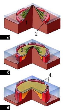 Коралловый риф. Стадии образования коралловых сооружений: а — риф на мелководье у вулканического острова; б — повышение уровня моря и затопление вулканического острова; в — низкие островки; 1 — вулканический остров; 2 — риф; 3 — лагуна; 4 — низкие островки.