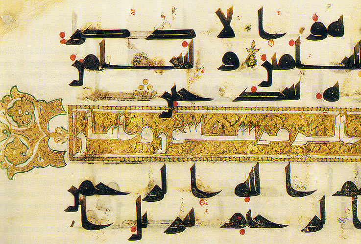 Куфическое письмо. Коран. В 7 в. возник прямолинейный, угловатый почерк куфи, а позднее было создано еще шесть мусульманских канонизированных почерков. Каждый каллиграф был обязан превосходно владеть хотя бы несколькими из них. Куфическое письмо украшает стены монументальных архитектурных сооружений, различные предметы прикладного искусства. Иногда сама надпись представляет собой законченное художественное целое — фриз или панно.