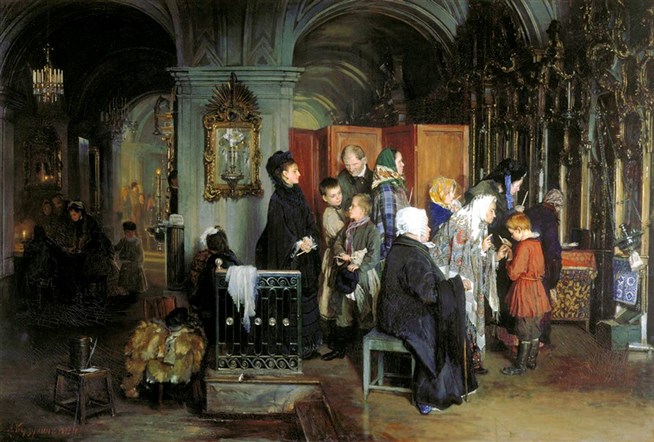 А.И. Корзухин. Перед исповедью. 1877 год.