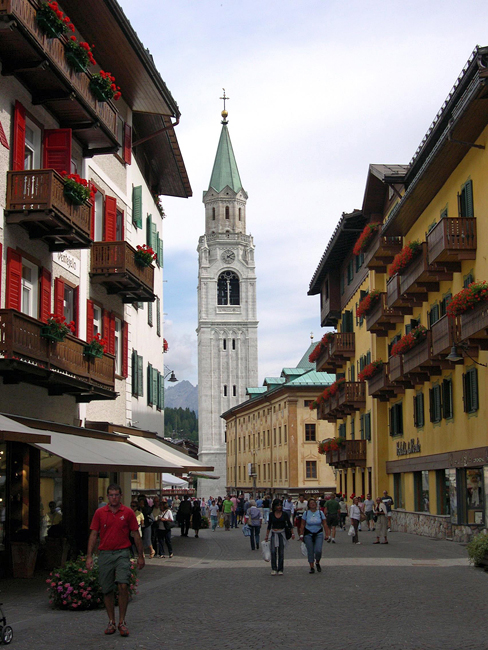 Кортина-д`Ампеццо. Вид на символ курорта — колокольню, высота которой 65 м. Возведена в 1858 году, ее колокола впервые звонили 19 ноября, на именины Елизаветы Австрийской (Сисси), супруги императора Франца-Иосифа.