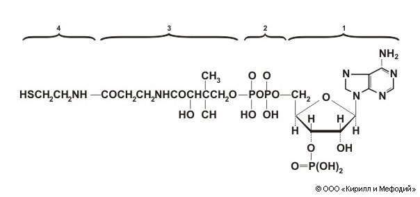 Структурная формула кофермента А. 1 — остаток адениловой кислоты, 2 — пирофосфатная группа, 3 — остаток пантотеновой кислоты, 4 — остаток бета-меркаптоэтаноламина.