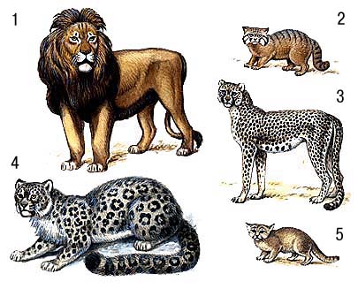 Кошачьи: 1 — лев; 2 — манул; 3 — гепард; 4 — снежный барс; 5 — барханная кошка.
