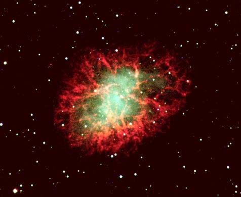 Крабовидная туманность - остаток взрыва сверхновой в созвездии Тельца, наблюдавшегося в 1054 году. После взрыва кроме туманности, образовалась нейтронная звезда, наблюдаемая как радиопульсар. В частях туманности, показанных красным цветом, электроны объединяются с протонами (рекомбинируют), образуя нейтральный водород. В частях, показанных зеленым цветом, электроны излучают, двигаясь по спиральным траекториям в магнитном поле.