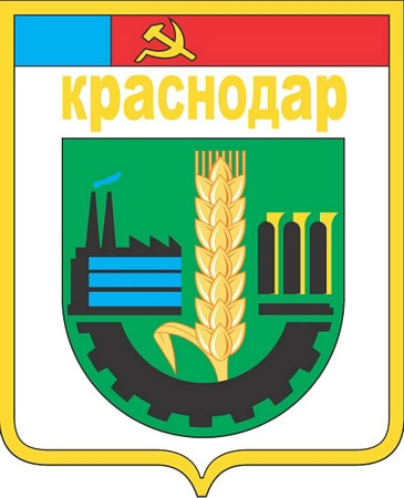 Герб Краснодара, принятый 26 октября 1979 года. Внизу герба бронзовая зубчатая шестеренка, рядом силуэты промышленных предприятий и золотой пшеничный колос.
