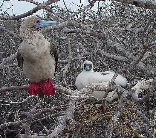 Птенец красноногой олуши и взрослая птица около гнезда.