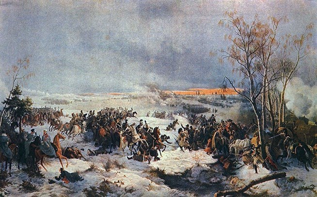 П. Гесс. Сражение под Красным 5 ноября. На переднем плане художник изобразил генерала М. А. Милорадовича, отдающего команду оказать помощь раненому французскому офицеру.