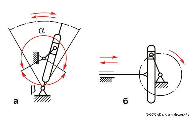 Кривошипно-кулисный механизм: а — с качающейся кулисой; б — с поступательно-движущейся кулисой (в приводе движения резания строгальных станков, α/β равно отношению времени прямого хода к времени обратного хода).