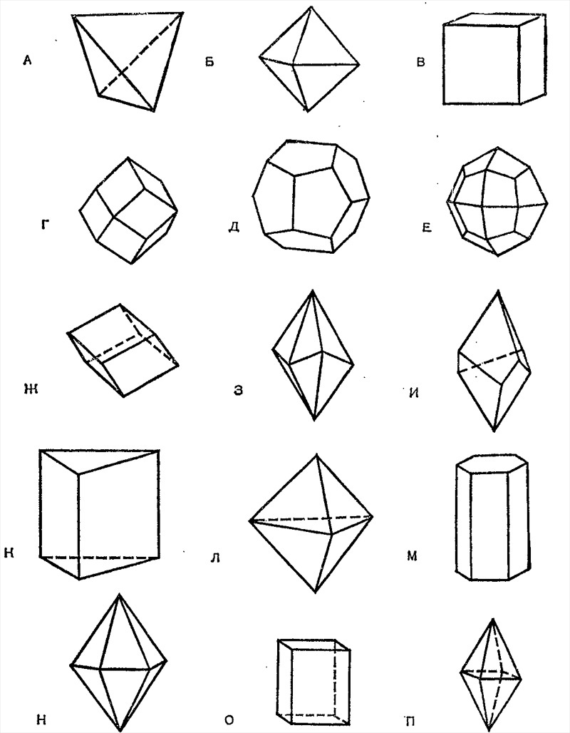 Формы кристаллических многогранников: А — тетраэдр, В — октаэдр, В — куб, Г — ромбододекаэдр, Д — пентагоидодекаэдр, Е — тетрагонтриоктаэдр (икоситетраэдр), Ж — ромбоэдр, 3 — скалендоэдр, И — трапецоэдр, К — трехгранная призма, Л — трехгранная бипирамида, М — шестигранная призма, Н — шестигранная бипирамида, О — четырехгранная призма, П — четырехгранная бипирамида