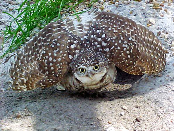 При опасности кроличий сыч щелкает клювом, топорщит свое оперение, но обычно не улетает.