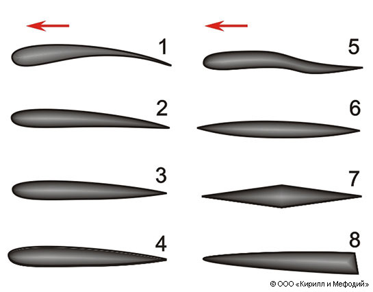 Типы профилей крыла: 1 — вогнуто-выпуклый; 2 — плоско-выпуклый; 3 — двояковыпуклый несимметричный; 4 — двояковыпуклый симметричный; 5 — S-oбразный; 6 — чечевицеобразный; 7 — ромбический; 8 — клиновидный. Стрелкой показано направление полета.