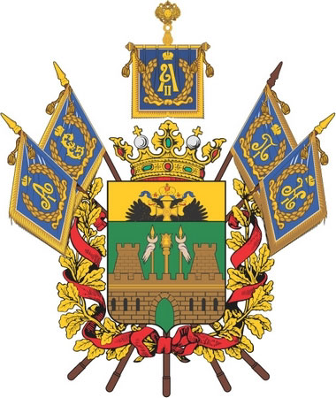 Герб Кубанской области Российской империи был утвержден 31 января 1874 года. «В зеленом щите золотая зубчатая стена с двумя таковыми же круглыми башнями, с открытыми воротами и черными швами; над башней золотой пернач между двух серебряных бунчуков с золотыми остриями, на золотых же древках. В золотой главе щита черный возникающий императорский орел, имеющий на груди Кавказский крест. Щит увенчан древней царской короной и украшен золотыми дубовыми листьями, соединенными александровской лентой; за щитом накрет положены четыре лазуревых знамени, украшенных золотой бахромой и с такими же окруженными дубовыми и лавровыми ветвями, коронованными вензелями Екатерины II, Павла I, Александра I и Николая I и в середине штандарт с вензелем Александра II».