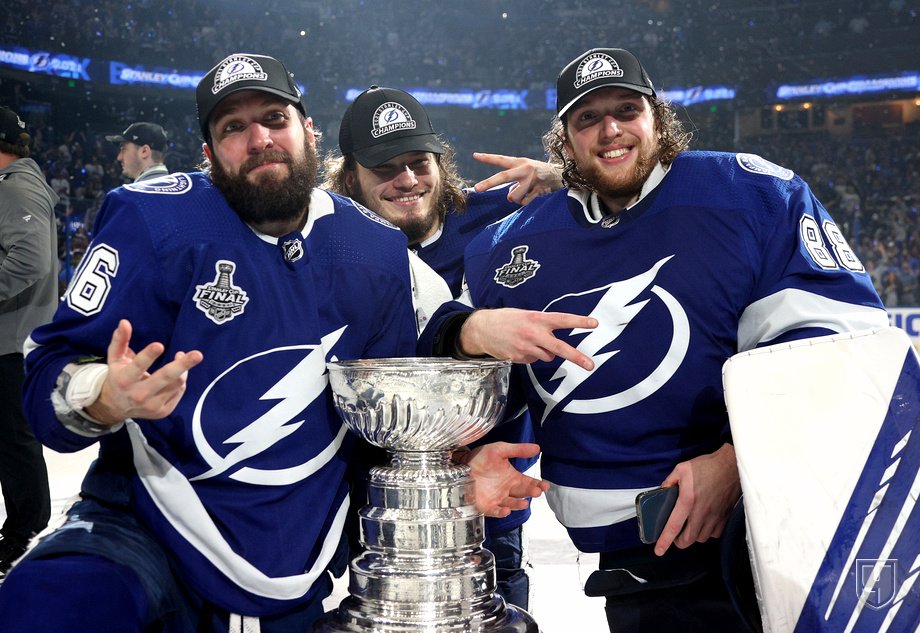 Андрей Василевский, Никита Кучеров и Михаил Сергачев в составе клуба «Тампа-Бэй Лайтнинг» стали обладателями Кубка Стэнли сезона 2021 года, повторив прошлогодний успех. Источник: Getty Images
