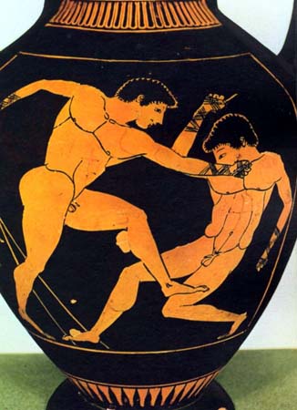 Финал кулачного боя — один из участников повержен. Рисунок на краснофигурной амфоре. Афины, Национальный археологический музей.