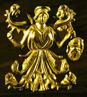 Куль-Оба. Бляшка «Богиня в калафе». 4 в. до н.э. Золото. Богиня с калафом на голове держит в левой руке бородатую маску Силена. Некоторые исследователи считают, что это отрубленная мужская голова. Из плеч богини вырастают шеи рогатых львиноголовых грифонов, а нижняя часть ее тела представлена в виде сложной пальметты с лепестками из змей, птичьих голов и грифонов. Вероятнее всего, это Апи, прародительница скифов, богиня земного и водного начала.