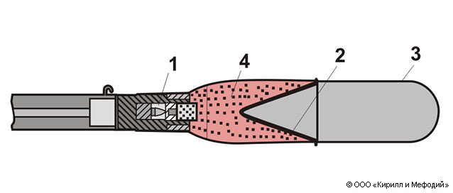 Поперечное сечение головной части реактивного противотанкового снаряда «базука» (США): 1 — взрыватель; 2 — коническая стальная оболочка; 3 — оживальная часть; 4 — взрывчатое вещество.