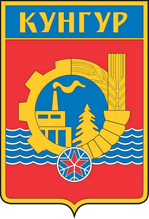 Герб Кунгура, принятый 27 июня 1972 года. На красном щите эмблема, состоящая из шестерни, колосьев, рога изобилия, силуэтов завода и ели, красной звезды. Эмблема наложена на три синие волны.