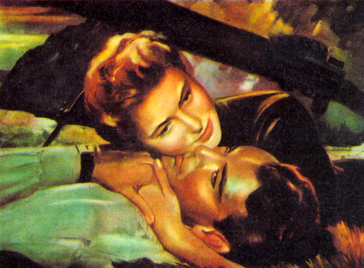Плакат к фильму «По ком звонит колокол» с участием Гари Купера и Ингрид Бергман. За право экранизации этого романа студия «Парамаунт» выплатила Эрнесту Хемингуэю 150 тысяч долларов. Постановку осуществил в 1943 году режиссер Сэм Вуд.