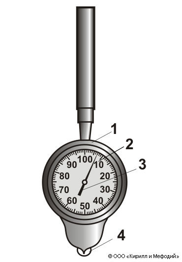 Курвиметр с неподвижным циферблатом и круговой шкалой: 1 — корпус; 2 — шкала; 3 — стрелка; 4 — обводное колесо.