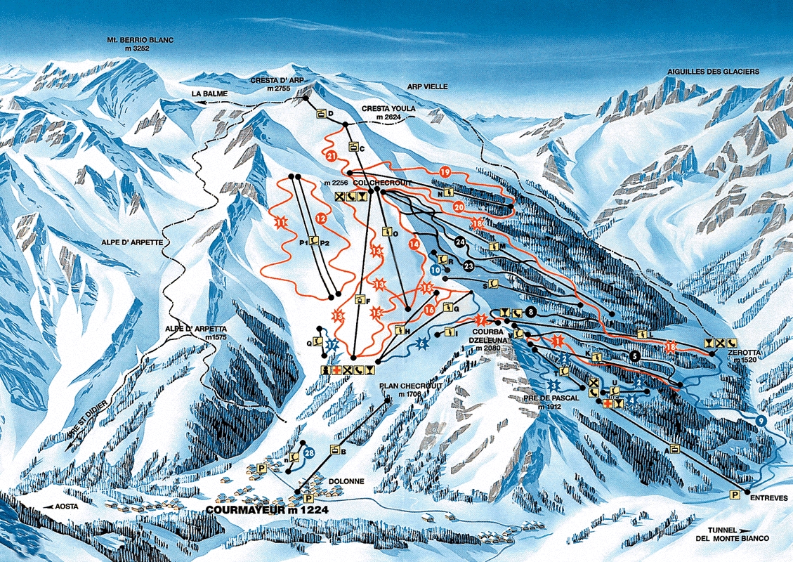 Схема горнолыжных трасс курорта Курмайор в Италии.