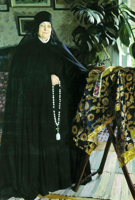 Б.М. Кустодиев. Монахиня. Портрет игуменьи Староладожского Успенского монастыря Олимпиады. Холст, масло. Русский музей, Петербург.