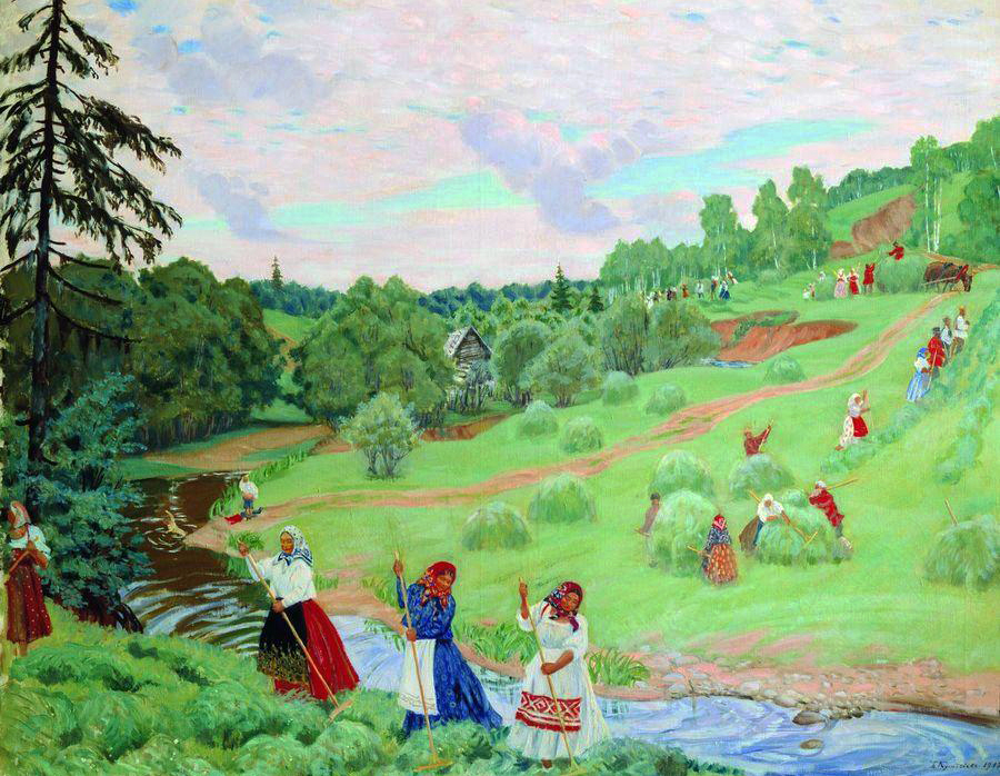 Б.М. Кустодиев. Сенокос. 1917 год. Картон, масло. Третьяковская галерея.