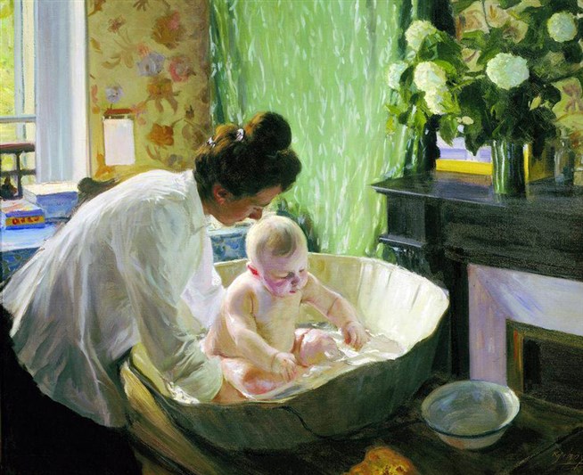 Б.М. Кустодиев. Утро. 1904 год. Холст, масло. Русский музей, Петербург. Юлия Евстафьевна Кустодиева, жена художника, с сыном-первенцем Кириллом (1903-1971). Картина написана в Париже.
