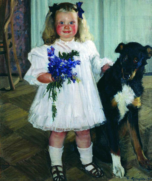 Б.М. Кустодиев. Портрет Ирины Кустодиевой с собакой Шумкой. 1907 год. Холст, масло. Саратовский художественный музей.