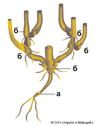 Схема кущения злака: а — зерновка с зародышевыми корнями; б — узлы кущения с придаточными корнями.
