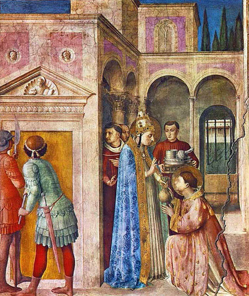 Фра Анджелико. Святой Лаврентий принимает дары церкви от Сикста II. Около 1447 года. Фреска в капелле Николая V в Папском дворце Ватикана.