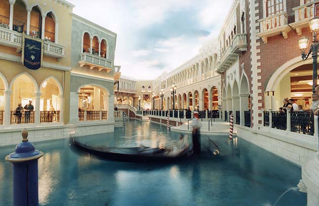 Отель «Венеция». В интерьере отеля с помощью современных технических средств воспроизведена живая натура со скользящими по воде гондолами и проплывающими над ними облаками.