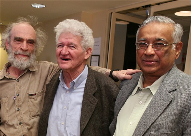 Лауреаты Абелевской премии (слева направо): Михаил Громов (2009), Питер Лакс (2003), Сриниваса Варадхан (2007). 2013 год. Фото: abelprize.no
