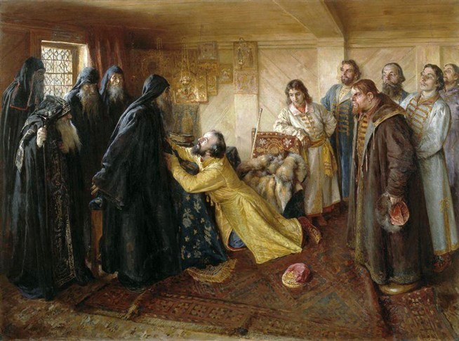 К.В. Лебедев. Царь Иван Грозный просит игумена Кирилло-Белозерского монастыря Кирилла благословить его в монахи. 1898 год. Холст, масло. Национальный художественный музей Белоруссии.