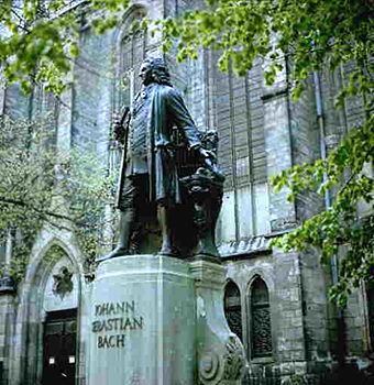 Лепциг. Памятник И-С. Баху перед Томаскирхе (церковью Св. Томаса), где он служил кантором.