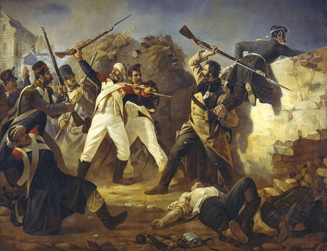 Полидор Иванович Бабаев (1813-1870). Подвиг гренадера лейб-гвардии Финляндского полка Л. Коренного в битве под Лейпцигом в 1813 году. 1846 год. Холст, масло. Русский музей, Петербург.