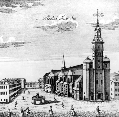 Собор святого Николая в Лейпциге. Гравюра неизвестного художника. 18 век.