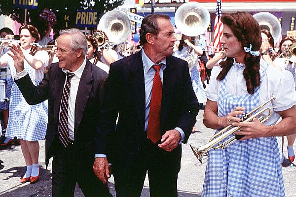 На параде гомосексуалистов. Бывшие президенты США Рассел Крамер и Метт Дуглас (Джек Леммон и Джеймс Гарнер) беседуют с “Дороти” (Джефф Ягер). Фильм "Мои дорогие американцы".