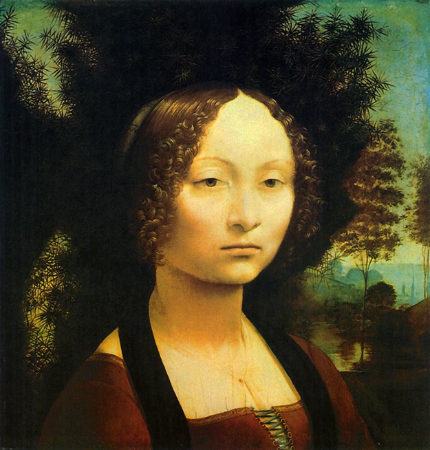 Леонарддо да Винчи. Портрет Джиневры де Бенчи. Около 1447-1476 годов. Дерево, масло. Национальная галерея, Вашингтон. Джиневра д’Америго де Бенчи (около 1456-1457 — около 1521-1530) — флорентийская аристократка и поэтесса.