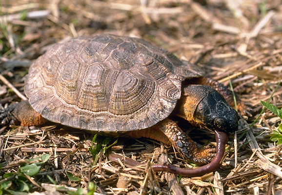 Североамериканская лесная черепаха (Clemmys inscilpta) основную часть времени проводит на суше, заходя в воду только в период размножения (для спаривания). Длина до 23 см.